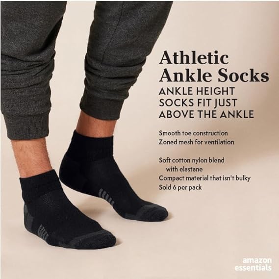 Amazon Essentials Men's Performance Cotton Cushioned Athletic Ankle Socks, 6 Pairs