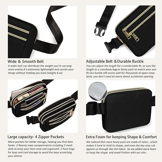 • 【Extra Foam for keeping Shape & Comfort】We noticed that most fanny packs on the market today are made of nylon stitched together, which makes it hard to hold its shape(It's actually wrinkled most of the time), and even the key may rub against us through the thin fabric. So we added extra foam on the back to keep the shape even when empty. At the same time, it separated the bag's contents to avoid friction with the skin.