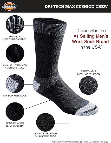 Dickies Men's Dri-tech Moisture Control Max Full Cushion Crew Socks Multipack