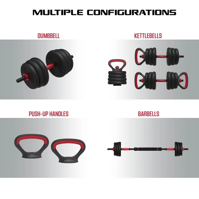 4-in-1 interchangeable weight system can be used as a barbell, kettlebell, two dumbbells, or push-up handles