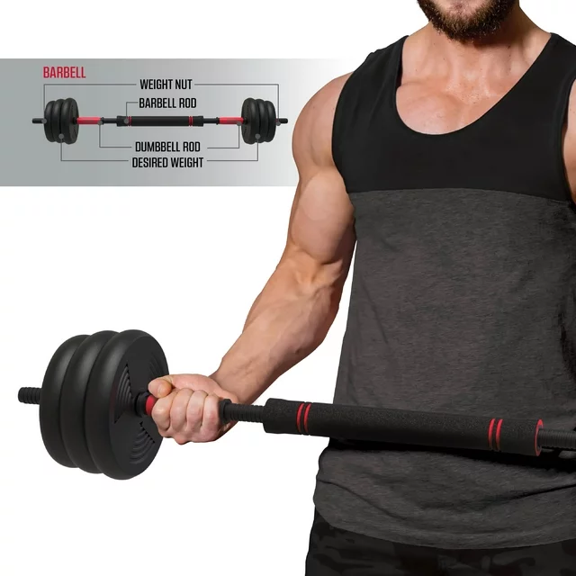 23-piece set: includes four 4lb plates, four 5lb plates, four 6lb plates, one barbell rod, two dumbbell bars, one kettlebell base, two push-up handles, and five screw nuts