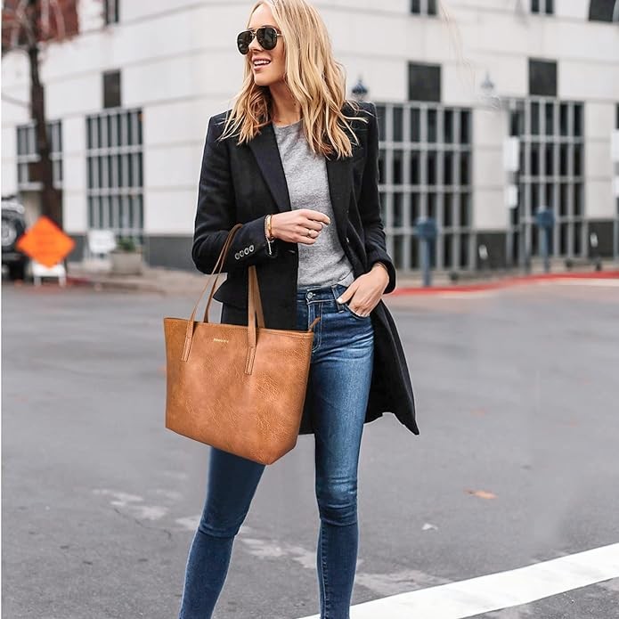 • MATERIAL: Crafted from buttery smooth PU leather (light-weight distressed-look) with soft fabric lining. This classic handbag is the effortlessly Tote you'll want to have and rely on for the rest of the time. It's simple yet elegant and spacious enough to carry your laptop or iPad.