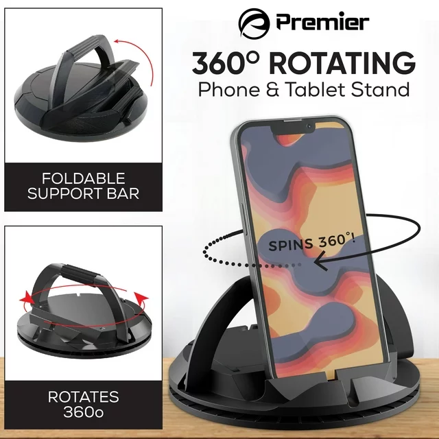 Attention tech lovers! Tired of holding your phone or tablet for extended periods while trying to watch videos, take photos, or attend video conferences? Say goodbye to sore arms and hello to the Premier Spin Stand - the ultimate 360-degree rotating phone and tablet stand. This premium cell phone holder is perfect for vlogging, video chats, web browsing, and more. With its unique 360-degree rotating base, you can easily adjust the viewing angle to find the perfect position while reducing annoying glare. You'll be pleased to know that this versatile electronic stand is compatible with most smartphones and tablets, making it the perfect addition to your home or office. Whether you have an iPhone 14/14 Plus/14 Pro/14 Pro Max/ iPhone 13/13 mini/ 13 Pro/13 Pro Max/ 12/ 12 mini/12 Pro Max/11/ 11 pro/ SE/ XS/ X/ 8/ 7/ 6/ 5/ 4, Samsung Galaxy S21/ S20/ S10/ S10+/ S10E/ Note10/S9/ S8 /S7 /S6 / S5, Sony, LG, Google/ Nexus, or another popular mobile device, this stand has got you covered. Action time! Upgrade your viewing experience and enjoy the convenience of hands-free device use with the Premier Spin Stand. Don't wait any longer - order yours today and experience the difference it can make in your daily routine. Say goodbye to tired arms and hello to effortless convenience with the Premier Spin Stand!