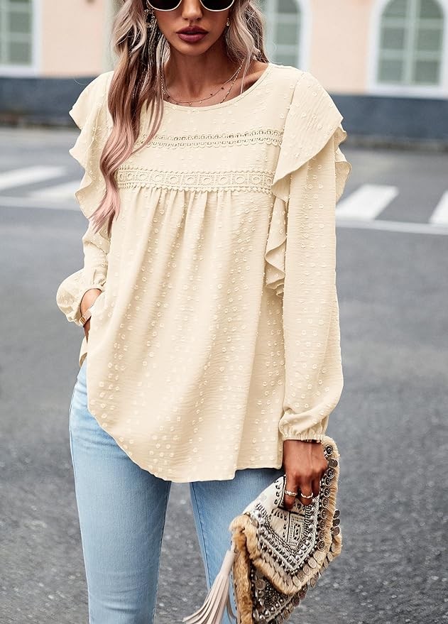 Design: Swiss dot fabric make this blouses for women fashion suitable for both dressy and casual occasions. Crochet and pleats at bust make this long sleeve tops feminine and chic, ruffle shoulder add cuteness for this blouses for women. Loose fit and tunic length are designed to be suitable for all body type, which can covers your hips