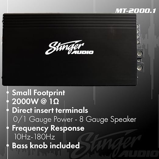 STINGER Audio MT20001 1-Channel Monoblock 2000 Watt RMS Car Audio Subwoofer Amplifier w/Remote Control Bass Knob, Class D, Hexfet Mosfet, Subsonic Filter, Low-Pass Filter, Bass