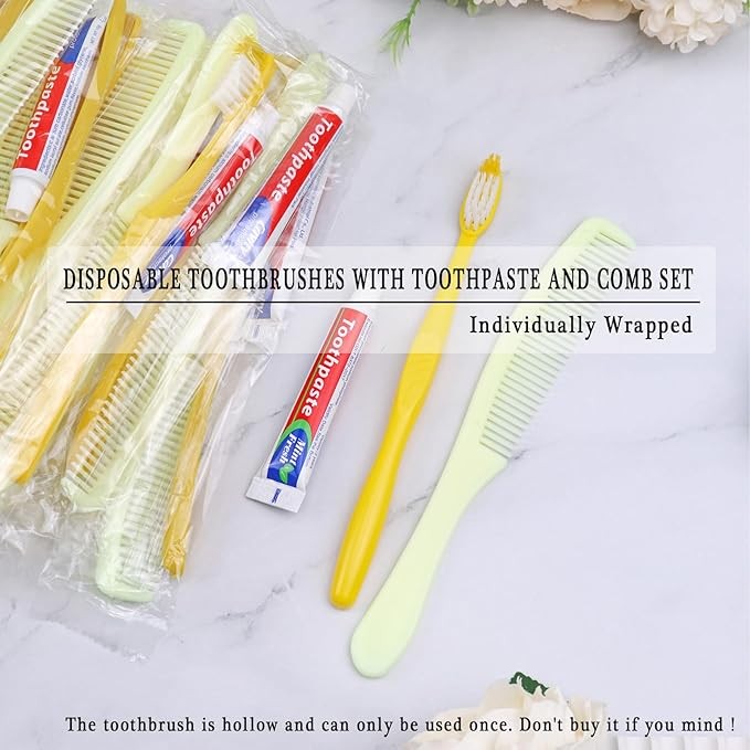 • 【?Individually Wrapped】The disposable toothbrush kit each includes a toothbrush, 10g toothpaste and comb.You receive 20 pcs of toothbrushes with toothpaste and comb set, enough for daily or travel use.