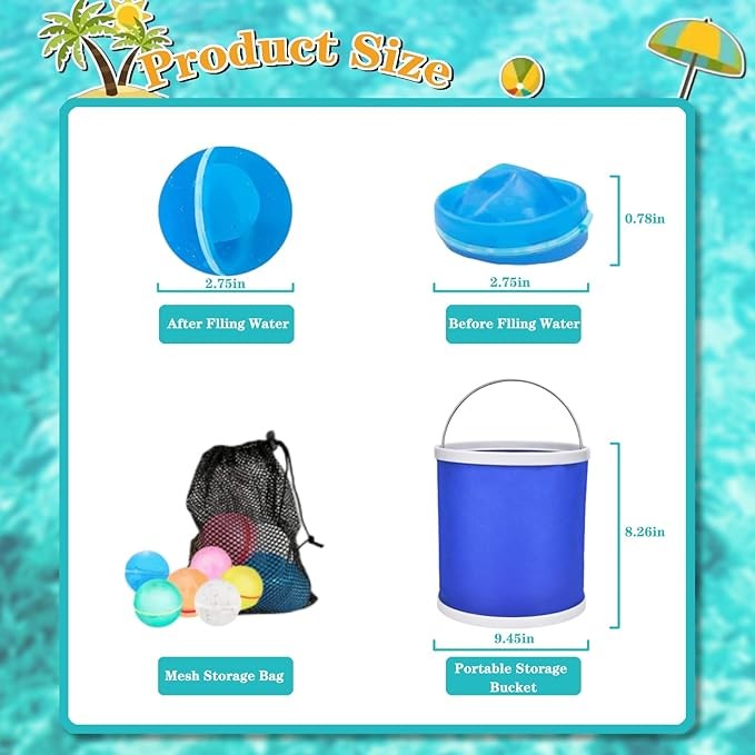 • 【High-Quality & Safety】The high quality silicone material is suitable for everyone, soft、skin-friendly and non-toxic, but also durable, to meet your requirements for multiple uses, for your carrying and storage, we are also equipped with net bags and collapsible buckets, so that you can enjoy the happiness of water balloon splashing more conveniently.